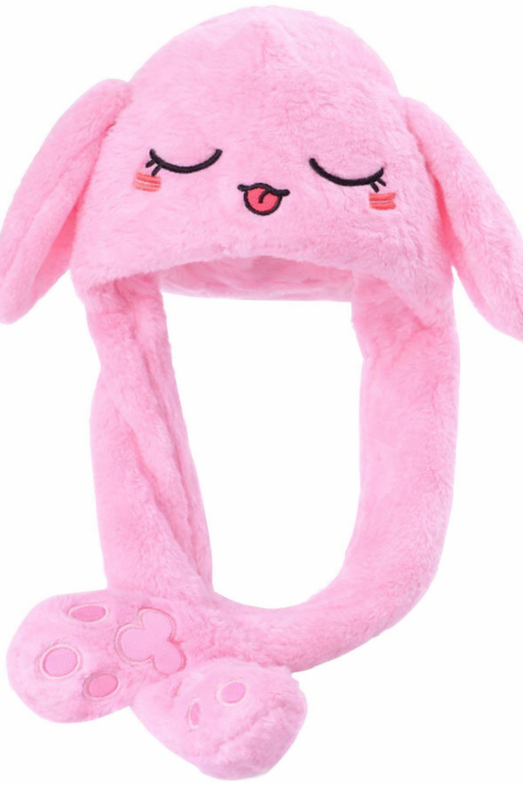 Adorable plush rabbit hat with funny jumping floppy ears. Press the hanging paws to move the ears — soft, warm and perfect for winter fun.